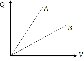 Ans. As $q=\frac{C}{V},$ and graph $A$ has a larger slope than $B,$ so the graph $A$ represents a capacitor $|$ of larger capacitance. Also $C=\frac{\varepsilon_{0} A}{d} \Rightarrow C \propto A .$ As the plate area of $C_{2}$ is double that of $C_{1},$ so has a larger capacitance. Hence the line $A$ of the graph corresponds to