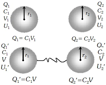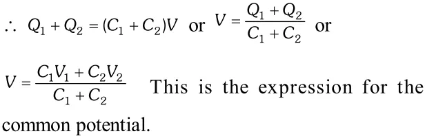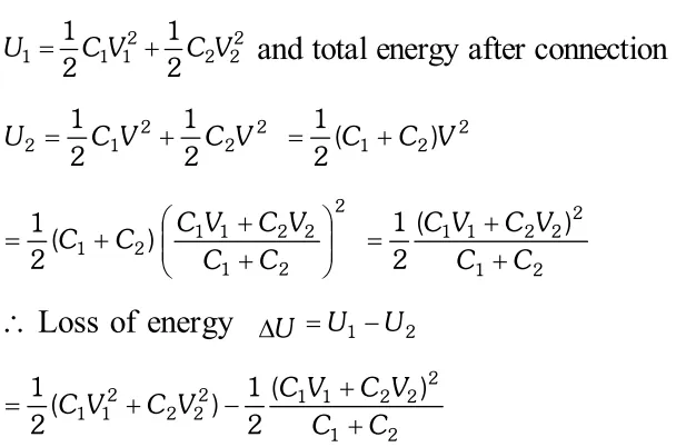 Q. Two charged conductors of capacitance $C_{1}$ and $C_{2}$ having potentials $V_{1}$ and $V_{2}$ respectively are connected by a conducting wire. Calculate the common potential and loss of energy in connection.