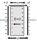 $F d x=\frac{1}{2} \varepsilon_{0} E^{2} A d x \Rightarrow F=\frac{1}{2} \varepsilon_{0} E^{2} A=\frac{1}{2}\left(\varepsilon_{0} A E\right) E$ $\Rightarrow F=\frac{1}{2}\left(\varepsilon_{0} A \frac{V}{d}\right) E \Rightarrow F=\frac{1}{2}(C V) E \Rightarrow F=\frac{1}{2} Q E$ The factor $\frac{1}{2}$ is in the expression due to the fact that plates are being moved against an average value $\frac{E}{2} .$ Q. A conducting slab of thickness $t$ ' is introduced without touching between the plates of a parallel plate capacitor, separated by a distance 'd' $(t