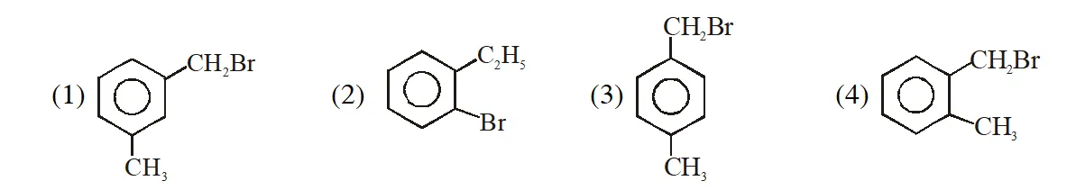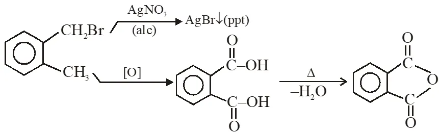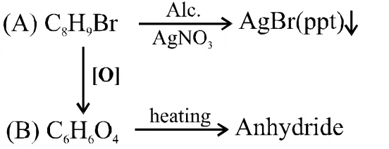 Q. Compound (A), $\mathrm{C}_{8} \mathrm{H}_{9} \mathrm{Br}$, gives a white precipitate when warmed with alcoholic $\mathrm{AgNO}_{3}$. Oxidation of (A) gives an acid (B), $\mathrm{C}_{8} \mathrm{H}_{6} \mathrm{O}_{4}$. (B) easily forms anhydride on heating. Identify the compound (A):
