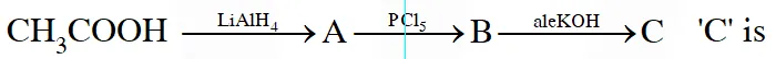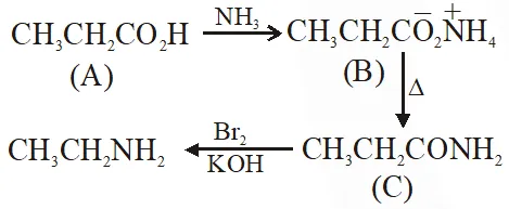 Q. An organic compound A upon reacting with $\mathrm{NH}_{3}$ gives B. On heating, B gives C. C in presence of KOH reacts with $\mathbf{B} \mathbf{r}_{2}$ to give $\mathrm{CH}_{3} \mathrm{CH}_{2} \mathrm{NH}_{2}$. A is :-