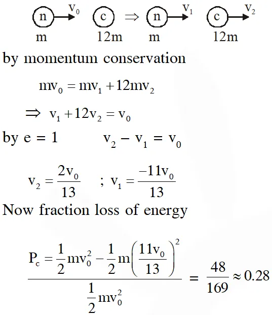 Q. It is found that if a neutron suffers an elastic collinear collision with deuterium at rest, fractional loss of its energy is $\mathrm{P}_{\mathrm{d}}$ ; while for its similar collision with carbon nucleus at rest, fractional loss of energy is $\mathrm{P}_{\mathrm{c}}$. The values of $\mathrm{P}_{\mathrm{d}}$ and $\mathrm{P}_{\mathrm{c}}$ are respectively :