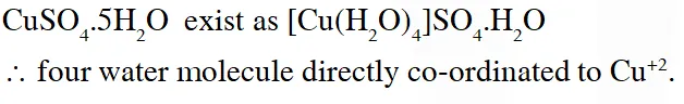 Q. The number of water molecule(s) directly bonded to the metal centre in $\mathrm{CuSO}_{4} \cdot 5 \mathrm{H}_{2} \mathrm{O}$ is