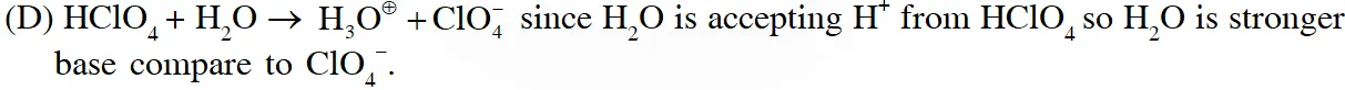 (D) The conjugate base of $\mathrm{HClO}_{4}$ is weaker base than $\mathrm{H}_{2} \mathrm{O}$