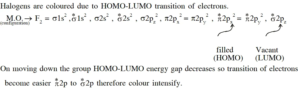 Q. The colour of the $\mathrm{X}_{2}$ molecules of group 17 elements changes gradually from yellow to violet down the group. This is due to –