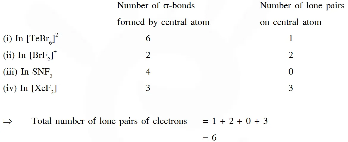 Q. The sum of the number of lone pairs of electrons on each central atom in the following species is.