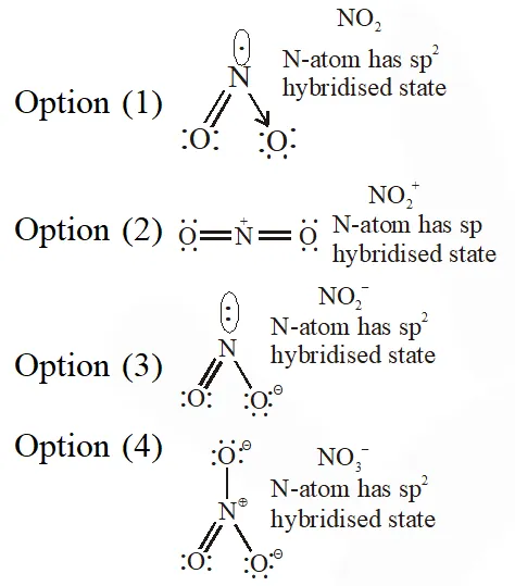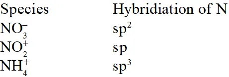 Q. The hybridisation of orbitals of N atom in $\mathrm{NO}_{3}^{-}, \mathrm{NO}_{2}^{+}$ and $\mathrm{NH}_{4}^{+}$ are respectively:-