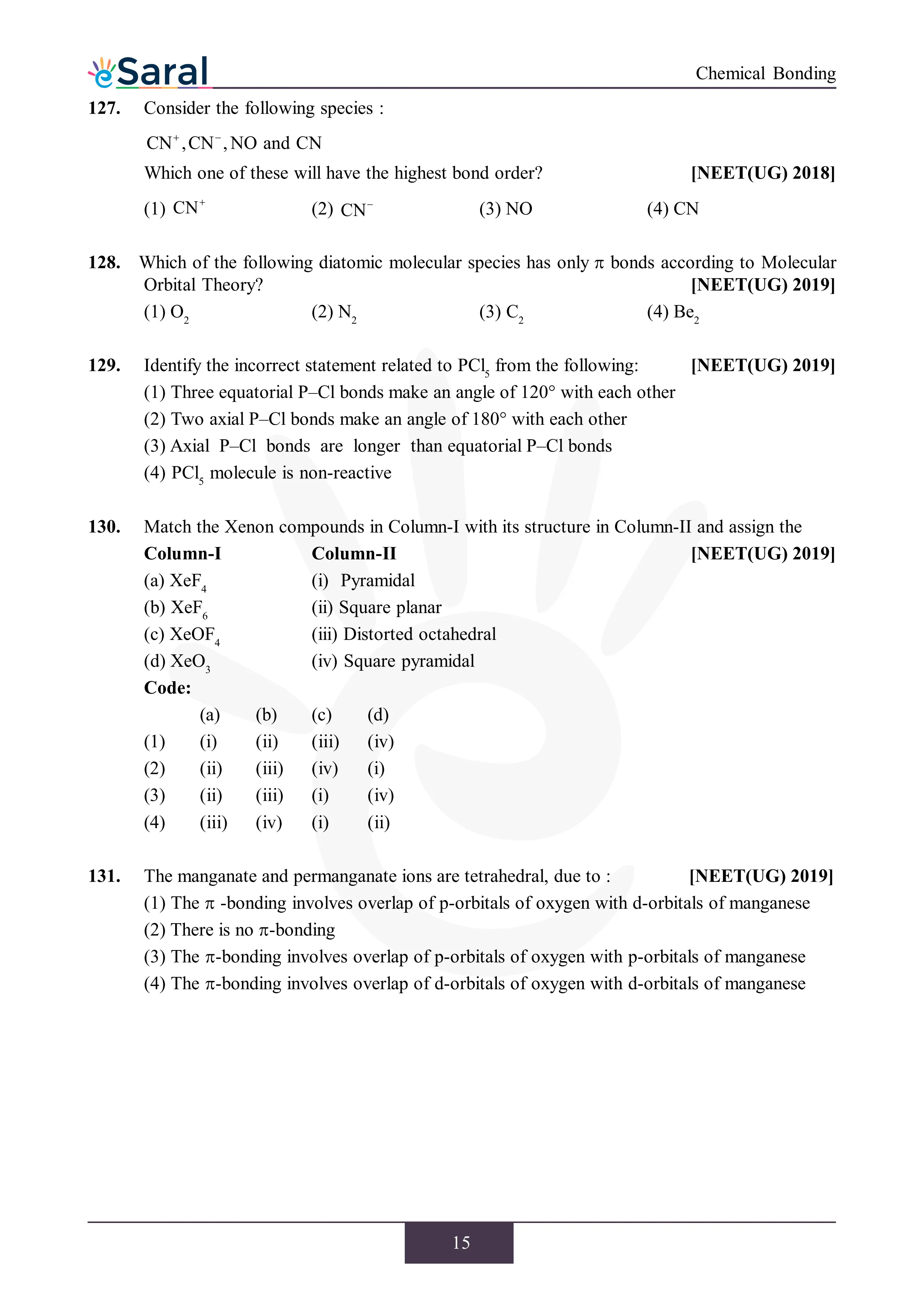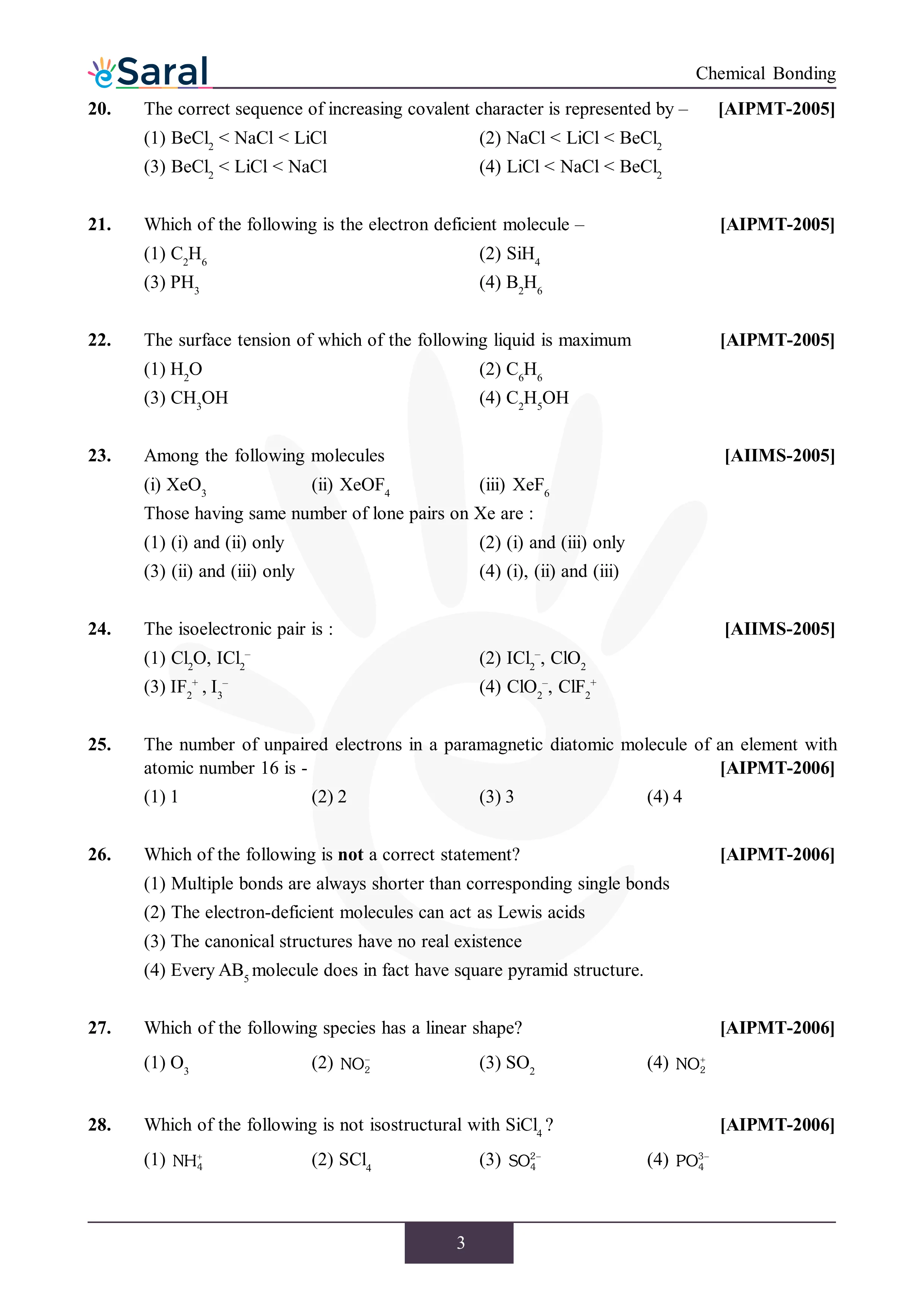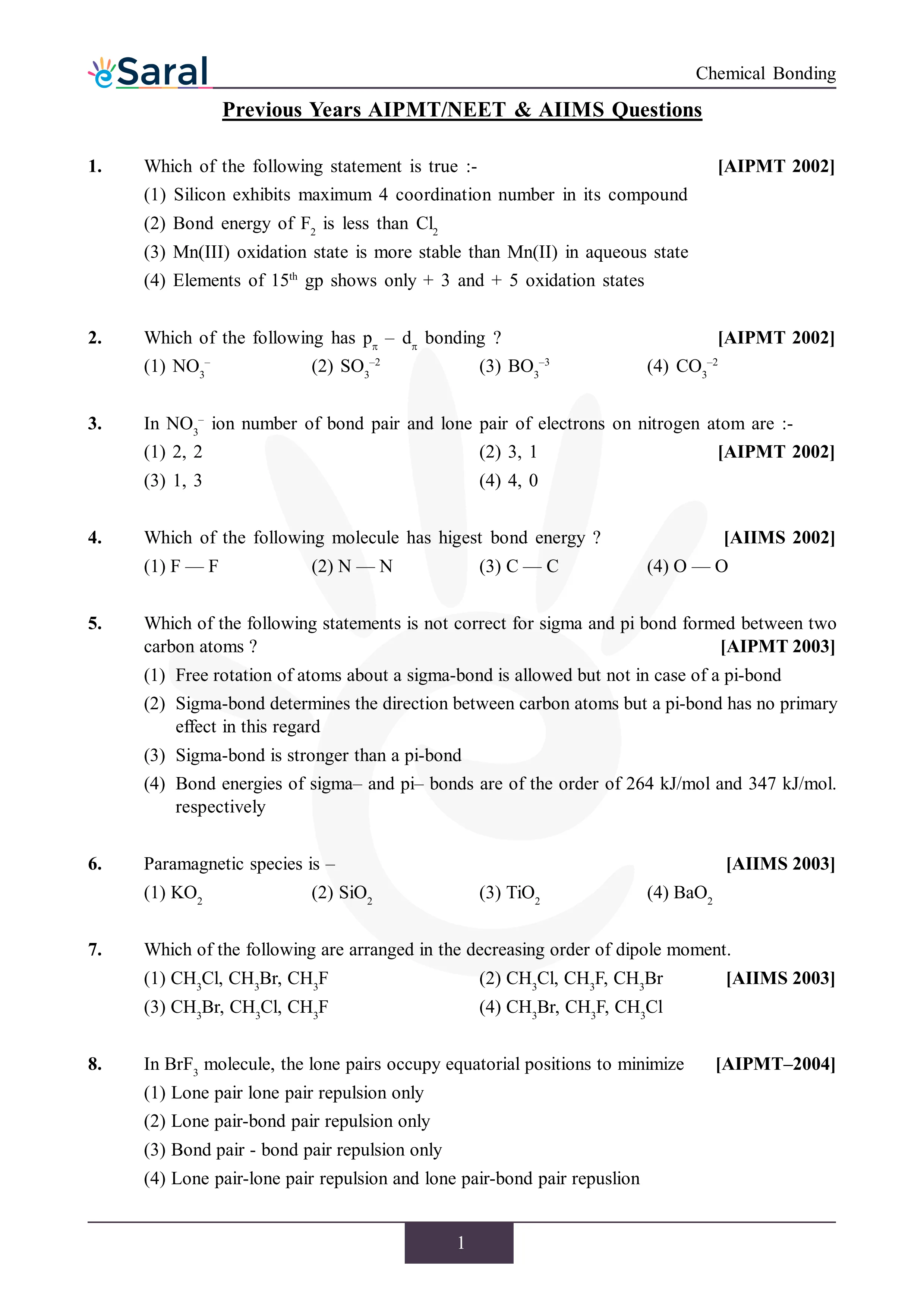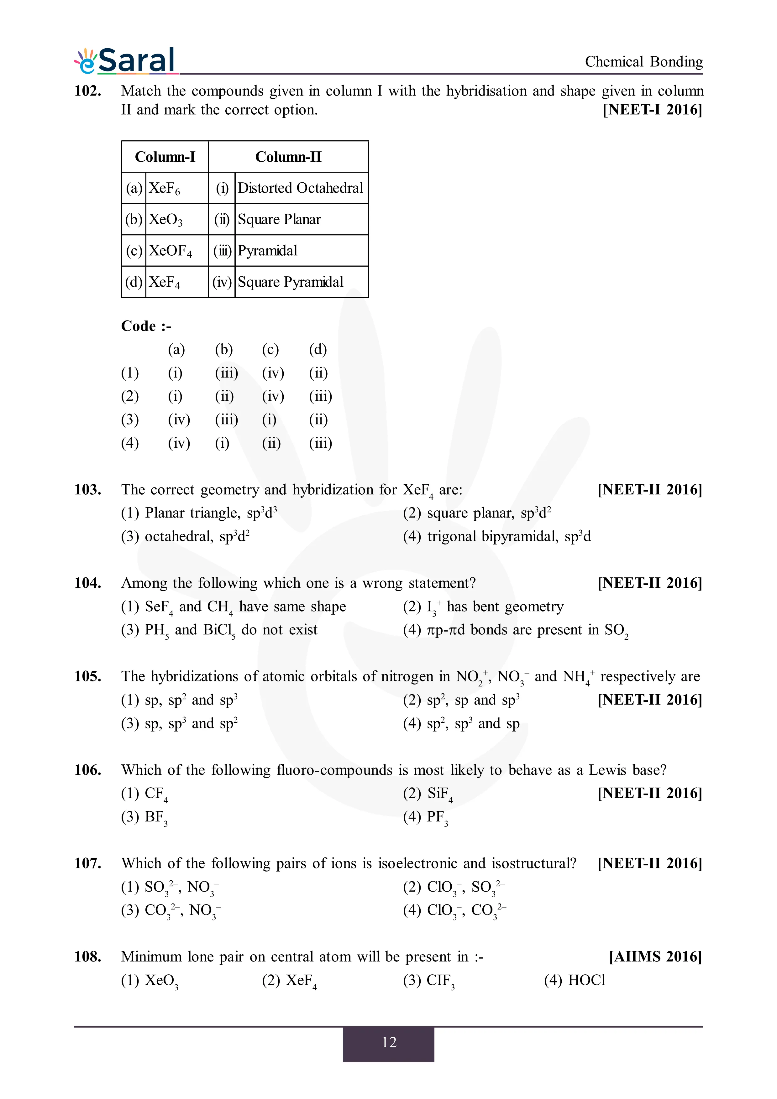 JEE Mains & AdvancedHere you will get Complete Chemical Bonding NEET Previous Year Questions with complete and detailed solutions.