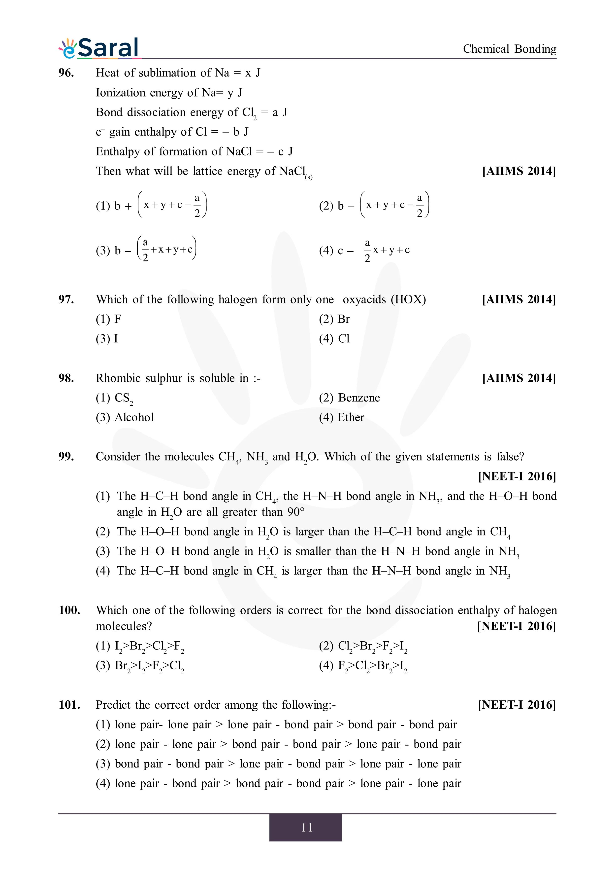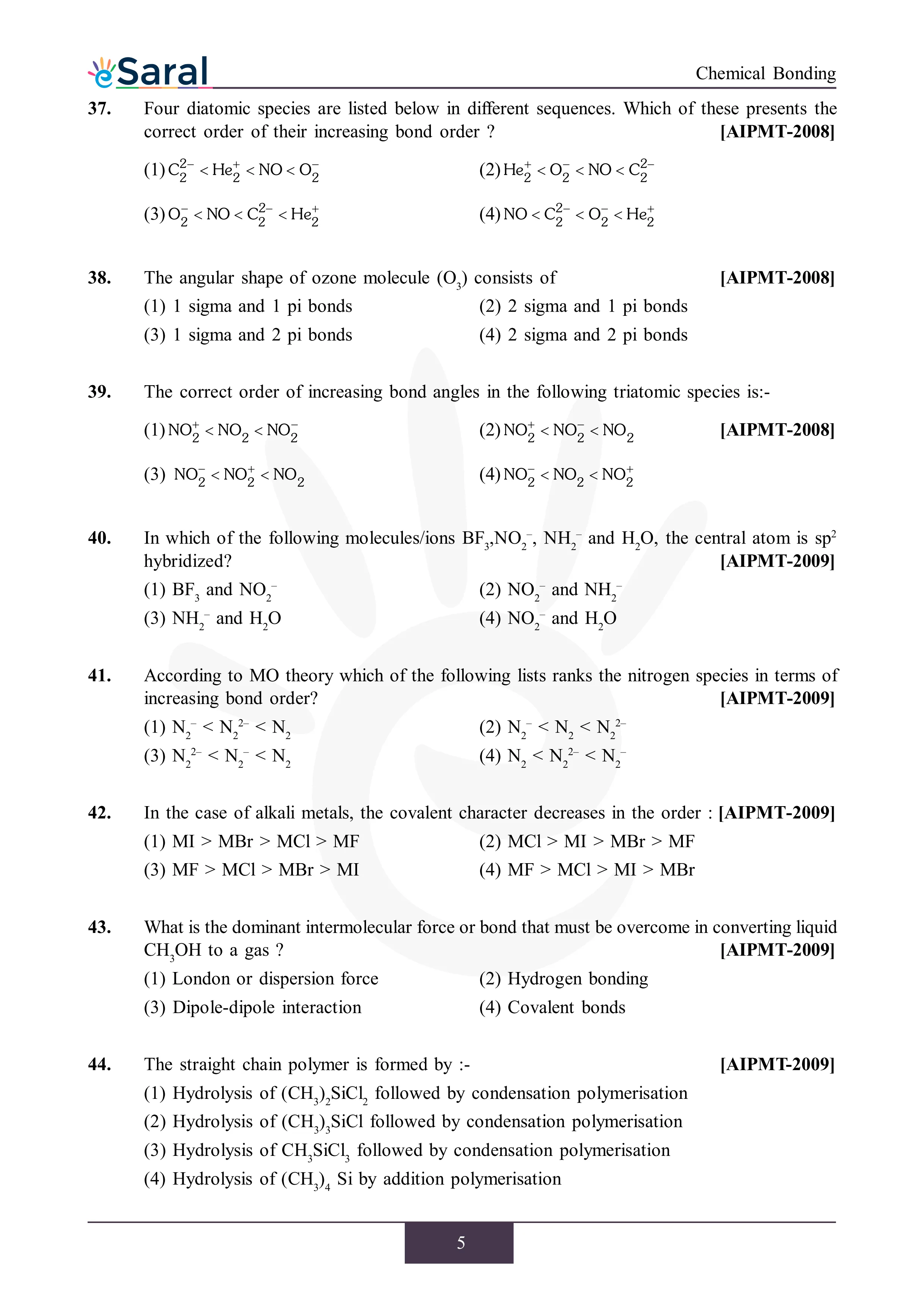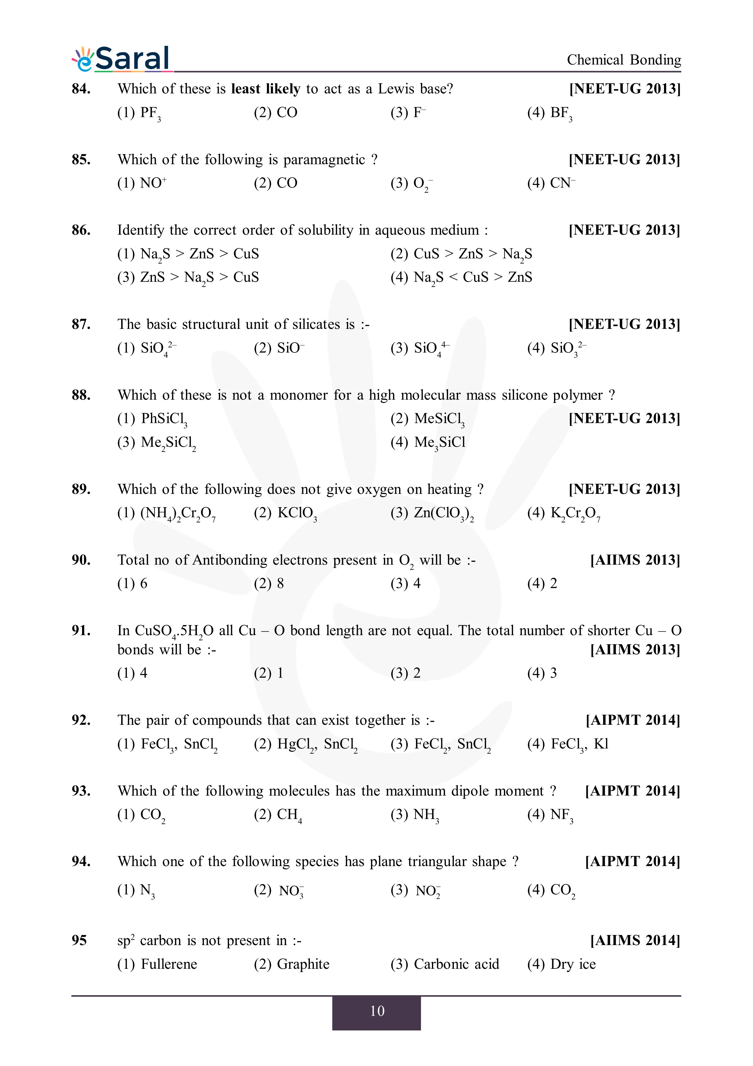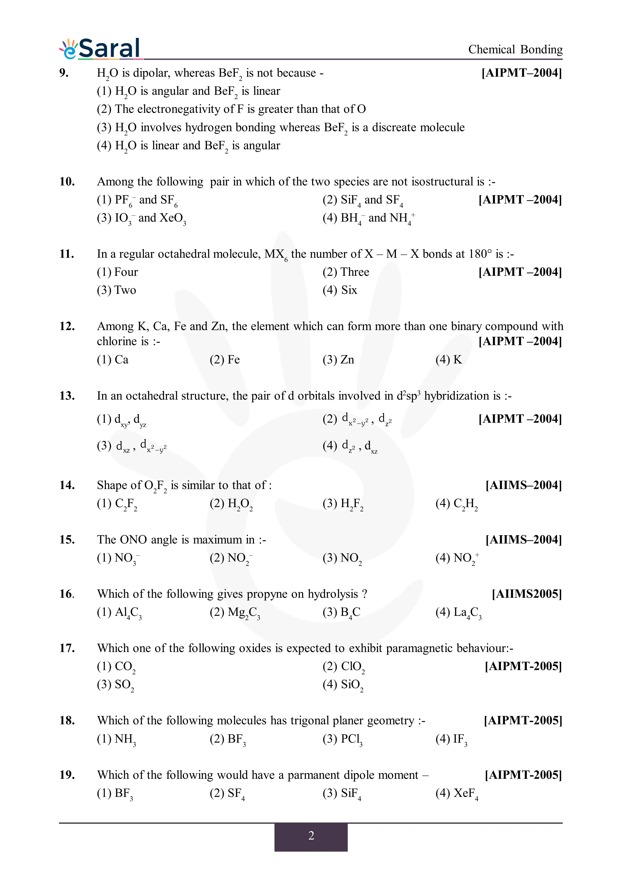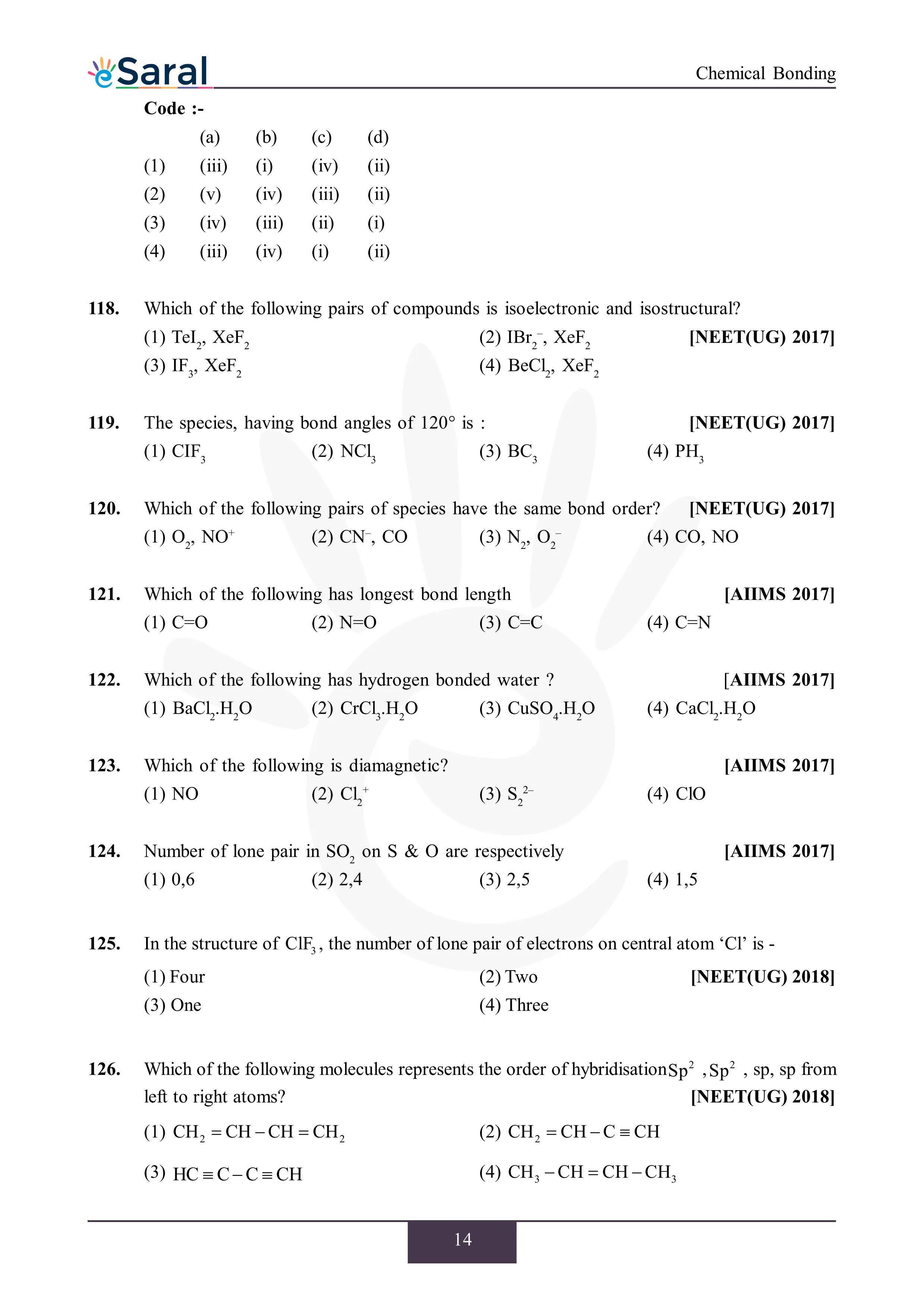 JEE Mains & AdvancedHere you will get Complete Chemical Bonding NEET Previous Year Questions with complete and detailed solutions.