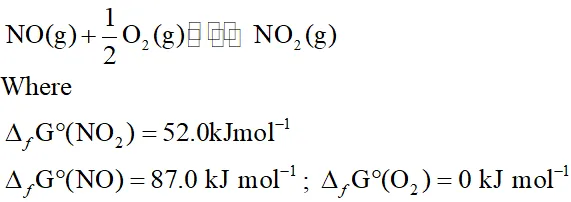 Q. Calculate (a) $\Delta \mathrm{G}^{\circ}$ and (b) the equilibrium constant for the formation of $\mathrm{NO}_{2}$ from $\mathrm{NO}$ and $\mathrm{O}_{2}$ at $298 \mathrm{K}$.