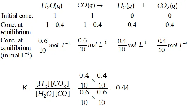 Q. 1 mole of $\mathrm{H}_{2} \mathrm{O}$ and 1 mole of $\mathrm{CO}$ are taken in a 10 litre vessel and heated to $725 \mathrm{K}$. At equilibrium, $40 \%$ of $\mathrm{H}_{2} \mathrm{O}$ (by mass) reacts with CO according to the equation: $\mathrm{H}_{2} \mathrm{O}(\mathrm{g})+\mathrm{CO}(\mathrm{g}) \rightleftharpoons \mathrm{H}_{2}(\mathrm{g})+\mathrm{CO}_{2}(\mathrm{g})$