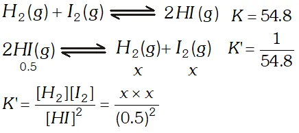 Q. At $700 K$ the equilibrium constant for the reaction $\mathrm{H}_{2}(\mathrm{g})+\mathrm{I}_{2}(\mathrm{g}) \rightleftharpoons 2 \mathrm{HI}(\mathrm{g})$ is $54.8 .$ If $0.5 \mathrm{mol} \mathrm{L}^{-1}$ of $\mathrm{HI}(\mathrm{g})$ is present at equilibrium at $700 K,$ what are the concentrations of $\mathrm{H}_{2}(\mathrm{g})$ and $\mathrm{I}_{2}(\mathrm{g})$ assuming that we initially started with HI (g) and allowed it to reach equilibrium at $700 K ?$