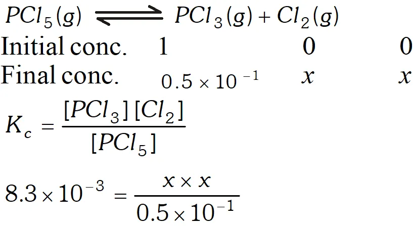 Q. A sample of pure $\mathrm{PCl}_{5}$ was introduced into an evacuated vessel at $473 \mathrm{K.}$ After equilibrium was attained, concentration of $\mathrm{PCl}_{5}$ was found to be $0.5 \times 10^{-1} .$ If value of $\mathrm{K}$ is $8.3 \times 10^{-3},$ what are the concentrations of $\mathrm{PCl}_{3}$ and $\mathrm{Cl}_{2}$ at equilibrium?