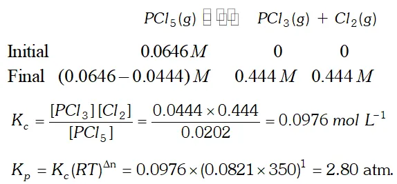 Q. Consider the following equilibrium: $P C l_{5}(g) \rightleftharpoons P C l_{3}(g)+C l_{2}(g)$ Initially, $0.0646 \mathrm{M} \mathrm{PCl}_{5}$ is introduced into a reaction vessel $350 \mathrm{K} .$ At equilibrium, $0.0444 \mathrm{M} \mathrm{Cl}_{2}$ is found. Calculate $K_{c}$ and $K_{p}$