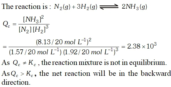Q. A mixture of $1.57 \mathrm{mol}$ of $N_{2}, 1.92$ mol of $\mathrm{H}_{2}$ and $8.13 \mathrm{mol}$ of $N H_{3}$ is introduced into a $20 L$ reaction vessel at 500 K. At this temperature, the equilibrium constant, $K_{c}$ for the reaction, $N_{2}(g)+3 H_{2}(g) \rightleftharpoons 2 N H_{3}(g)$ is $1.7 \times 10^{2}$ Is the reaction mixture at equilibrium ? If not, what is the direction of the net reaction?