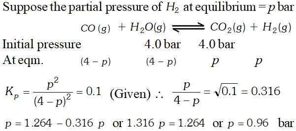 Q. Hydrogen gas used in Haber's process is produced by reacting methane from natural gas with high temperature steam. The first stage of two stage reaction involves the formation of $\mathrm{CO}$ and $\mathrm{H}_{2} .$ In second stage, $\mathrm{CO}$ formed in first stage is reacted with more steam in water gas shift reaction, $C O(g)+H_{2} O(g) \rightleftharpoons C O_{2}(g)+H_{2}(g) .$ If a reaction vessel at $400^{\circ} \mathrm{C}$ is charged with an equimolar mixture of $\mathrm{CO}$ and steam such that $p_{\mathrm{CO}}=p_{H_{2} O}=4.0$ bar, what will be the partial pressure of $H_{2}$ at equilibrium? $K_{p}=0.1$ at $400^{\circ} \mathrm{C}$