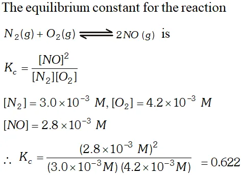 Q. At equilibrium the concentration of $N_{2}, O_{2}$ and $N O$ in a sealed vessel at $800 K$ are: $N_{2}=3.0 \times 10^{3} M, O_{2}=4.2 \times 10^{3} M \&$ $N O=2.8 \times 10^{-3} \mathrm{M} \cdot$ Calculate the equilibrium constant $K_{c}$ for the reaction $: N_{2}(g)+O_{2}(g) \rightleftharpoons 2 N O(g)$