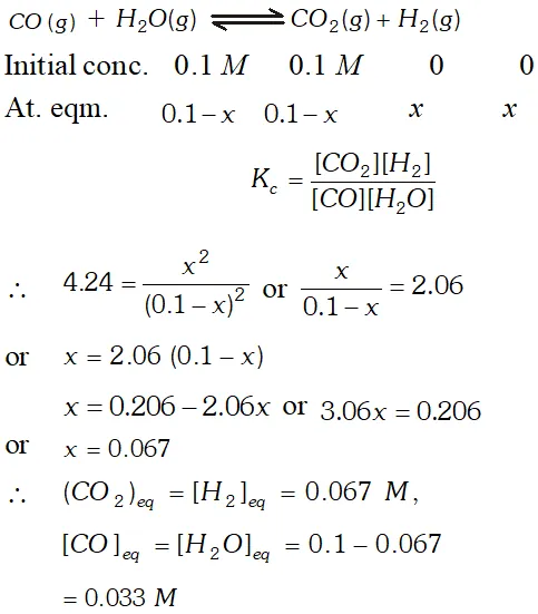 Q. The value of $K_{c}=4.24$ at $800 K$ for the reaction $\mathrm{CO}(g)+H_{2} \mathrm{O}(g) \rightleftharpoons \mathrm{CO}_{2}(g)+H_{2}(g) \quad$ Calculate equilibrium concentrations of $\mathrm{CO}_{2}, \mathrm{H}_{2}, \mathrm{CO}$ and $\mathrm{H}_{2} \mathrm{O}$ at $800 K,$ if only $\mathrm{CO}$ and $\mathrm{H}_{2} \mathrm{O}$ are present initially at concentration of $0.10 \mathrm{Meach} ?$