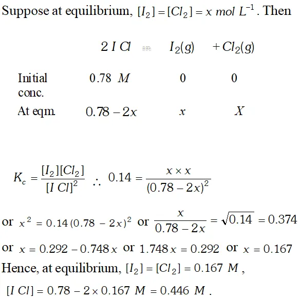 Q. What is the equilibrium concentration of each of the substances in the equilibrium when the initial concentration of ICI was 0.78 M ? $2 I C l(g) \rightleftharpoons I_{2}(g)+C l_{2}(g), K_{c}=0.14$