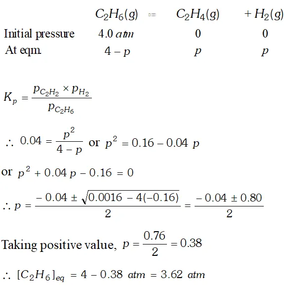 Q. $K_{p}=0.04$ atm at $899 \mathrm{K}$ for the equilibrium shown below. What is the equilibrium concentration of $C_{2} H_{6}$ when it is placed in a flask at 4.0 atm. Pressure and allowed to come in equilibrium? $C_{2} H_{6}(g) \rightleftharpoons \mathrm{C}_{2} \mathrm{H}_{4}(\mathrm{g})+\mathrm{H}_{2}(\mathrm{g})$