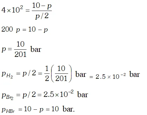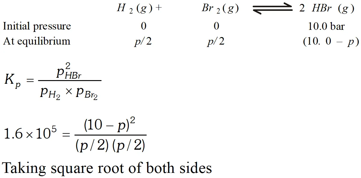 Q. The equilibrium constant for the following reaction is $1.6 \times 10^{5}$ at $1024 \mathrm{K}$ $H_{2}(g)+B r_{2}(g) \rightleftharpoons 2 H B r(g)$ Find the equilibrium pressure of all gases if 10.0 bar $\mathrm{HBr}$ is introduced into a sealed container at $1024 K$