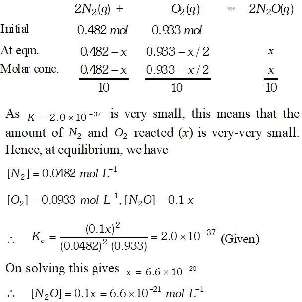 Ans. $2 N_{2}(g)+O_{2}(g) \rightleftharpoons 2 N_{2} O(g)$ Concentration of $N_{2}=0.482 \mathrm{mol}$ Molar concentration of $N_{2}$ at equilibrium $=\frac{0.482}{10 L}=0.0482 \mathrm{mol} \mathrm{L}^{-1}$ $=\frac{0.482}{10 L}=0.0482 \mathrm{mol} L^{-1}$ Molar concentration of $O_{2}$ at equilibrium $=\frac{0.953}{10 L}=0.0933 \mathrm{mol} L^{-1}$ $K_{c}=\frac{\left[N_{2} \mathrm{O}\right]^{2}}{\left[N_{2}\right]^{2}\left[\mathrm{O}_{2}\right]^{1}} \Rightarrow 2.0 \times 10^{-37}=\frac{\left[N_{2} \mathrm{O}\right]^{2}}{[0.0482]^{2}[0.0933]}$ $\left[N_{2} \mathrm{O}\right]=6.6 \times 10^{-21} \mathrm{mol} L^{-1}$