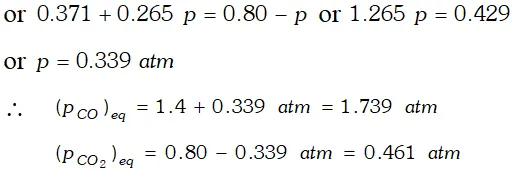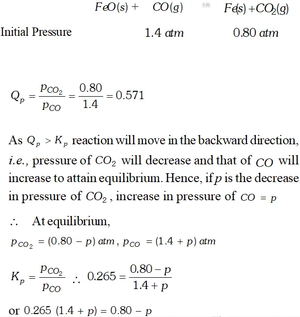 Q. One of the reactions that takes place in producing steel from iron ore is the reduction of iron (II) oxide by carbon monoxide to given iron metal and $C O_{2}$ $F e O(s)+C O(g) \rightleftharpoons F e(s)+C O_{2}(g) ; K_{p}=0.265 \quad$ at $1050 K$ What are the equilibrium partial pressures of $\mathrm{CO}$ and $\mathrm{CO}_{2}$ at $1050 \mathrm{K}$ if the initial pressure are : $p_{\mathrm{CO}}=1.4$ atm and $p_{C O_{2}}=0.80$ atm ?