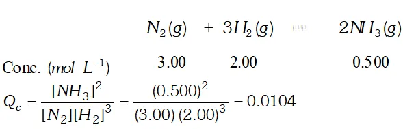 Ans. $Q_{c}=\frac{\left[N H_{3}\right]^{2}}{\left[N_{2}\right]\left[H_{2}\right]^{3}}=\frac{(0.5)^{2}}{(3.0)(2.0)^{3}}=0.0104$ As $Q_{c} \neq K_{c},$ reaction is not in equilibrium. As $Q_{c}