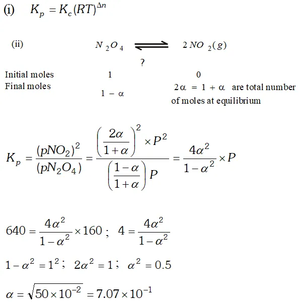 Q. (i) Derive the relationship between $K_{p}$ and $K_{c} .$ (ii) The $K_{p}$ for the reaction $N_{2} O_{4} \rightleftharpoons 2 N O_{2}$ is 640 $m m$ at $775 K .$ Calculate the $\%$ dissociation of $N_{2} O_{4}$ at equilibrium pressure of $160 \mathrm{mm} .$ At which pressure the dissociation will be $50 \%$