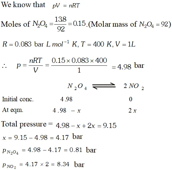 Q. $13.8 \mathrm{g}$ of $\mathrm{N}_{2} \mathrm{O}$ was placed in a $1 \mathrm{L}$ reaction vessel at 400 $K$ and allowed to attain equilibrium : $N_{2} O_{4}(g) \rightleftharpoons$ $2 \mathrm{NO}_{2}(\mathrm{g}) .$ The total pressure at equilibrium was found to 9.15 bar. Calculate $K_{c}, K_{p}$ and partial pressure at equilibrium.