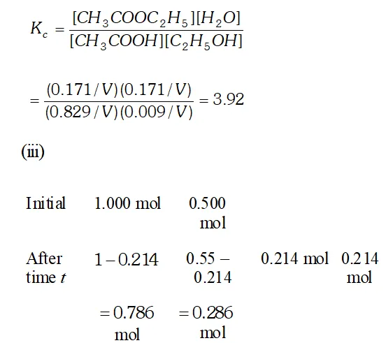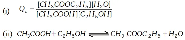 Q. Ethyl acetate is formed by the reaction between ethanol and acetic acid and the equilibrium is represented as: $\left.\mathrm{CH}_{3} \mathrm{COOH} / \mathrm{l}\right)+\mathrm{C}_{2} \mathrm{H}_{5} \mathrm{OH}(\mathrm{l}) \rightleftharpoons \mathrm{CH}_{3} \mathrm{COO}_{4} \mathrm{f}_{5}(\mathrm{l})+\mathrm{H}_{2} \mathrm{O}(\mathrm{l})$ (i) Write the concentration ratio (reaction quotient), $Q_{c},$ for this reaction (Note: water is not in excess and is not a solvent in this reaction). (ii) At $293 K,$ if one starts with 1.00 mol of acetic acid and 0.18 mol of ethanol, there is $0.171 \mathrm{mol}$ of ethyl acetate in the final equilibrium mixture. Calculate the equilibrium constant. (iii) Starting with 0.5 mol of ethanol and 1.0 mol of acetic acid and maintaining it at $293 \mathrm{K}, 0.214 \mathrm{mol}$ of ethyl acetate is found after some time. Has equilibrium been reached ?