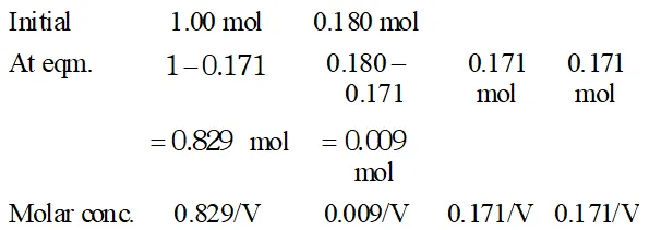 Ans. $2 \mathrm{NO}(g)+B r_{2}(g) \rightleftharpoons 2 \mathrm{NOBr}(g)$ (i) According to the above equation 0.0518 mol of $\mathrm{NOBr}$ are formed from 0.0518 mol of $N O$ $\therefore$ Amount of nitric oxide at equilibrium $=0.087-0.0518$ $=0.0352 \mathrm{mol}$ Similarly, $0.0518 \mathrm{mol}$ of $\mathrm{NOBr}$ are formed from $\frac{0.0518}{2} \mathrm{mol}$ of $\mathrm{Br}_{2}$ $\therefore$ Amount of bromine at equilibrium $=0.0437-\frac{0.0518}{2}=0.0178 \mathrm{mol}$ (ii) $\quad K_{c}=\frac{[N O B r]^{2}}{\left[N O^{2}\right]\left[B r_{2}\right]}$ At equilibrium $[\mathrm{NOBr}]=0.0518 \mathrm{mol},[\mathrm{NO}]=0.0352 \mathrm{mol}$ $\left[B r_{2}\right]=0.0178 \mathrm{mol}$ $\therefore \quad K_{c}=\frac{(0.0518)^{2}}{(0.0352)^{2} \times(0.0178)}=121.66$