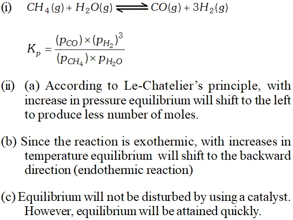 Ans. $C H_{4}(g)+H_{2} O(g) \rightleftharpoons C O(g)+3 H_{2}$ (i) $\quad K_{p}=\frac{\left(P_{\mathrm{CO}}\right)\left(P_{\mathrm{H}_{2}}\right)^{3}}{\left(P_{\mathrm{CH}_{4}}\right)\left(P_{\mathrm{H}_{2} \mathrm{O}}\right)}$ (ii) $\quad K_{p}$ is not affected by increasing pressure (b) will increase with increase in temperature because it is endothermic process. (c) is not affected by catalyst.