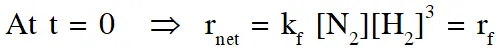 As time proceeds $\Rightarrow \mathrm{r}_{\mathrm{net}}=\mathrm{k}_{\mathrm{f}}\left[\mathrm{N}_{2}\right]\left[\mathrm{H}_{2}\right]^{3}-\mathrm{k}_{\mathrm{b}}\left[\mathrm{NH}_{3}\right]^{2}$