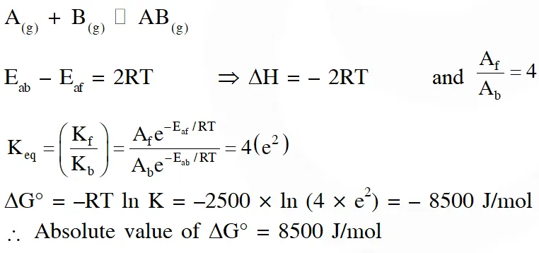 The activition energy of the backward reaction exceeds that of the forward reaction by 2RT $\left(\text { in } \mathrm{J} \mathrm{mol}^{-1}\right)$. If the pre-exponential factor of the forward reaction is 4 times that of the reverse reaction, the absolute value of $\Delta \mathrm{G}^{\theta}$(in J mol–1) for the reaction at 300 K is____.