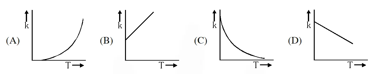 Q. Plots showing the variation of the rate constant (k) with temperature (T) are given