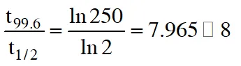 $\frac{1}{\mathrm{t}_{1 / 2}} \ln \frac{100}{50}=\frac{1}{\mathrm{t}_{99.6 \%}} \ln \frac{100}{0.4}$