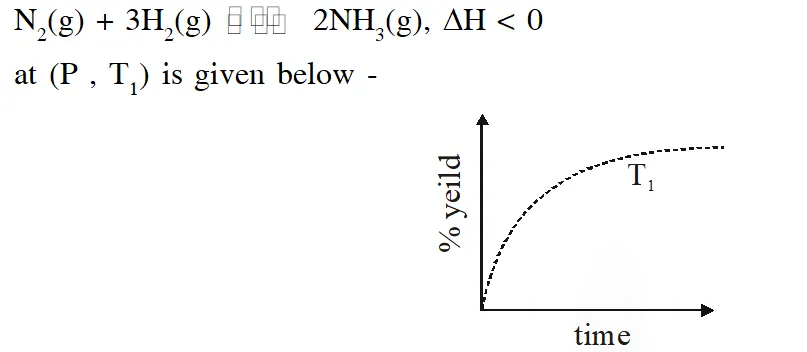 If this reaction is conducted at $\left(P, T_{2}\right)$, with $\mathrm{T}_{2}>\mathrm{T}_{1}$, the % yield of ammonia as a function of time is represented by –