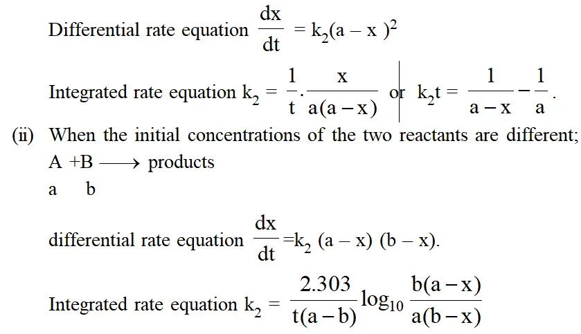 (i) When two molecules of the same reactant are involved or the concentrations of the both reactants are equal reactions $2 \mathrm{A} \longrightarrow$ products or $\mathrm{A}+\mathrm{B} \longrightarrow$ products.