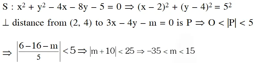 Q. The circle $\mathrm{x}^{2}+\mathrm{y}^{2}=4 \mathrm{x}+8 \mathrm{y}+5$ intersects the line $3 \mathrm{x}-4 \mathrm{y}=\mathrm{m}$ at two distinct points if :-