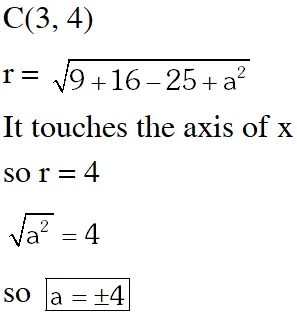 Q. If the circle $x^{2}+y^{2}-6 x-8 y+\left(25-a^{2}\right)=0$ touches the axis of $x,$ then a equals :-