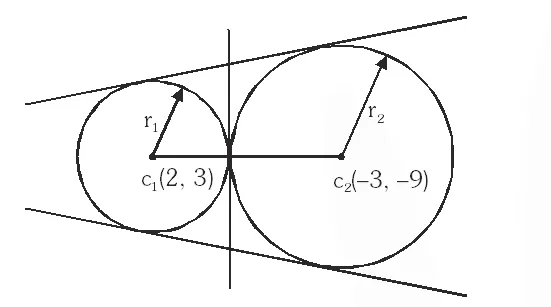 $\mathrm{c}_{1} \mathrm{c}_{2}=\mathrm{r}_{1}+\mathrm{r}_{2}$ is a case of external touching (as shown in above figure), so three common tangentscan be drawn.