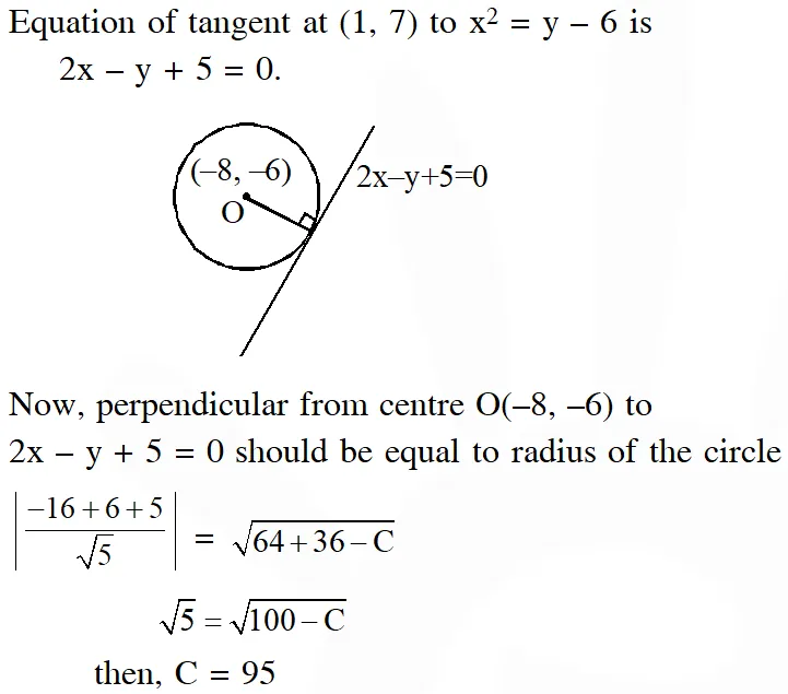Q. If the tangent at $(1,7)$ to the curve $x^{2}=y-6$ touches the circle $x^{2}+y^{2}+16 x+12 y+c=0$ then the value of $c$ is :