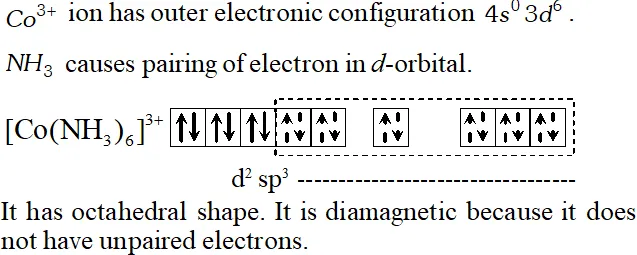 Q. Using valence bond theory of complexes, explain the geometry and diamagnetic nature of the ion $\left[C o\left(N H_{3}\right)_{6}\right]^{3+}$ [At. no. of $C o=27]$