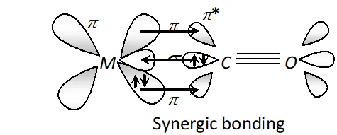 Ans. The metal-carbon bond in metal carbonyls possess both $s$ and $p$ character. The $M-C \sigma$ bond is formed by the donation of lone pair of electrons on the carbonyl carbon into a vacant orbital of the metal. The $M-C \pi$ -bond is formed by the donation of a pair of electrons from a filled $d$ -orbital of metal into the vacant antibonding $\pi^{*}$ orbital of carbon monoxide. The metal to ligand bonding creates a synergic effect which strengthens the bond between $C O$ and the metal.