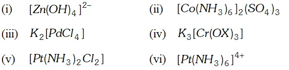 Ans. (a) Ligands are $N H_{3},$ the charge on it is zero. $H_{2} O$ has zero charge. $C l$ has negative charge $(-1)$