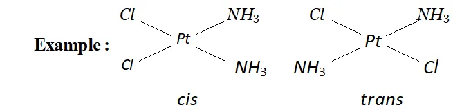 For example, in a square planar complex of formula $\left[M X_{2} L_{2}\right]$ the two ligands $X$ may be arranged adjacent to each other in a cis isomer, or opposite to each other in a trans isomer.