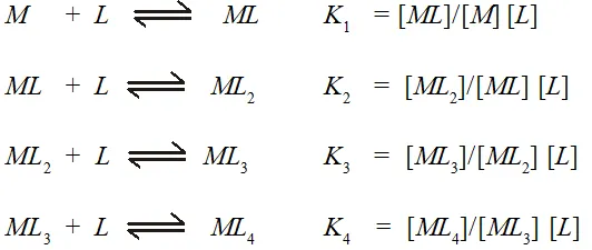 Where $K_{1}, K_{2},$ etc., are referred to as stepwise stability constants. Alternatively, we can write the overall stability constant thus:
