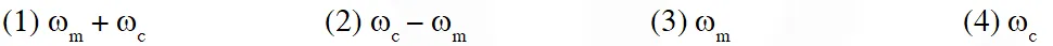 Q. In amplitude modulation, sinusoidal carrier frequency used is denoted by $\omega_{\mathrm{c}}$ and the signal frequency is denoted by $\omega_{\mathrm{m}}$. The bandwidth $\left(\Delta \omega_{\mathrm{m}}\right)$ of the signal is such that $\Delta \omega_{\mathrm{m}}<<\omega_{\mathrm{c}}$. Which of the following frequencies is not contained in the modulated wave ?