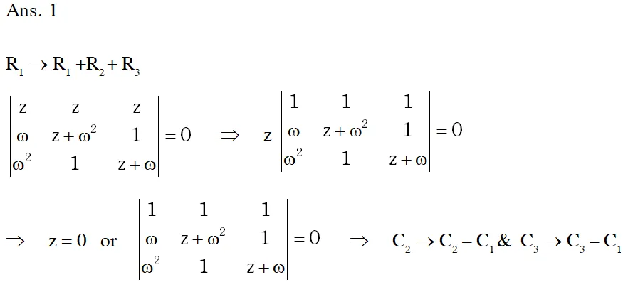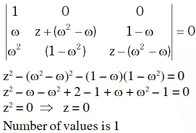 Q. Let $\omega$ be the complex number $\cos \frac{2 \pi}{3}+$ isin $\frac{2 \pi}{3} .$ Then the number of distinct complex numbers $z$ satisfying $\left|\begin{array}{ccc}{\mathrm{z}+1} & {\omega} & {\omega^{2}} \\ {\omega} & {\mathrm{z}+\omega^{2}} & {1} \\ {\omega^{2}} & {1} & {\mathrm{z}+\omega}\end{array}\right|=0$ is equal to